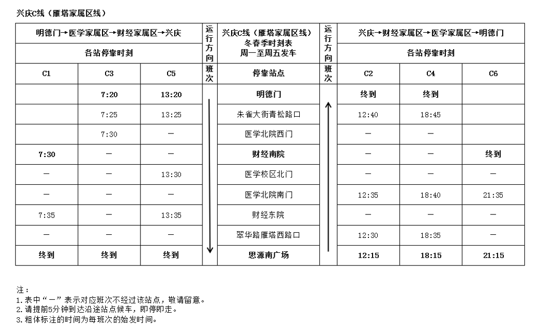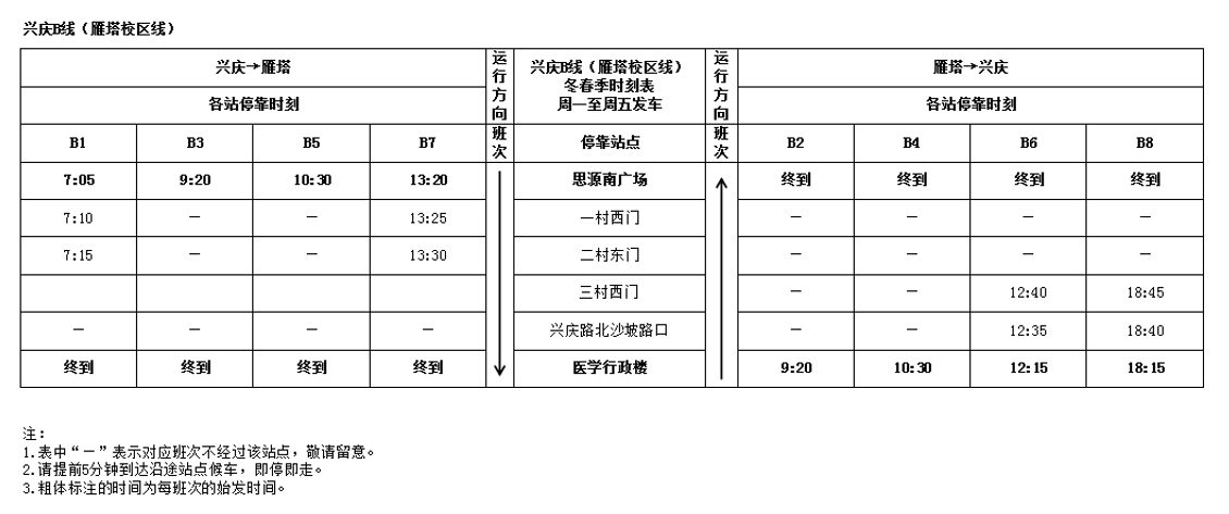 附:兴庆校区班车运行时刻表(试行,冬春季)