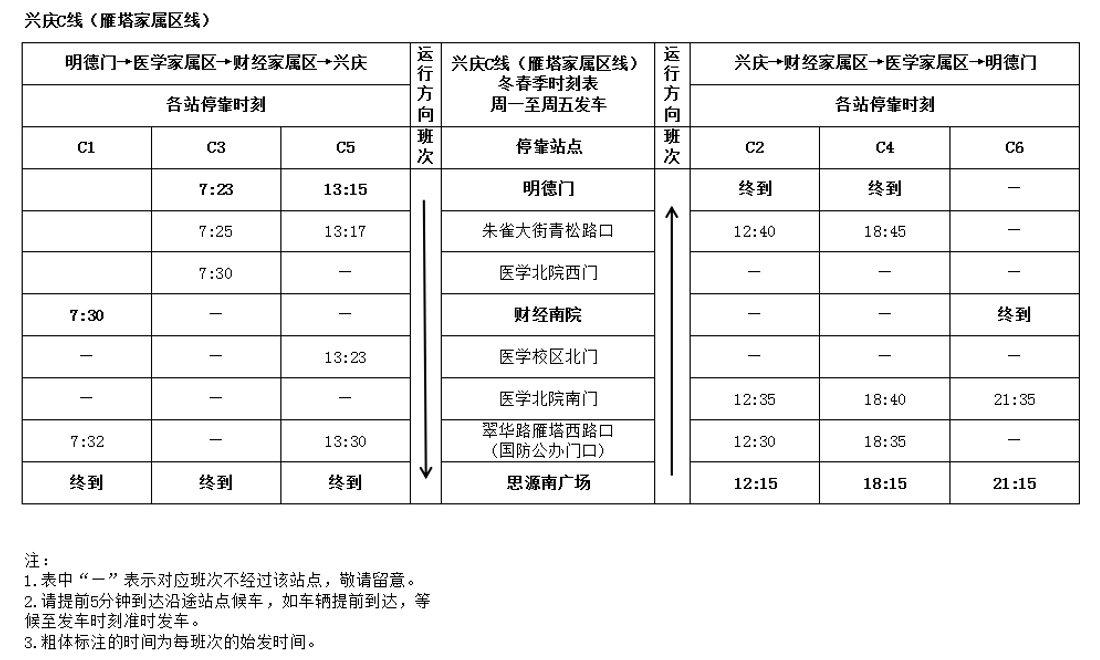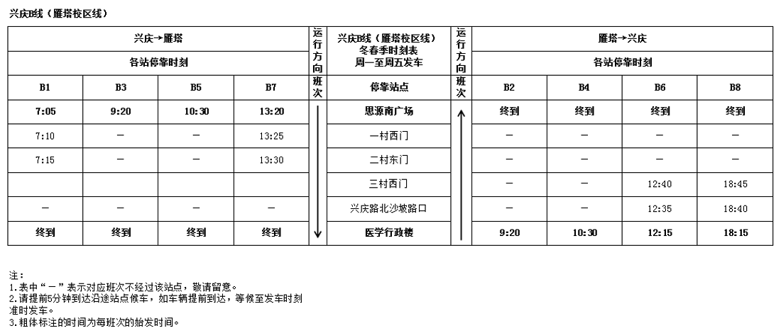 为持续优化班车服务效能,切实满足师生日常出行需求,自2025年11月10日起对调整后的班车时刻及线路试行, 同时对教职工反馈的建议采纳优化,现决定自2025年11月26日起正式调整兴庆校区班车运行时刻及线路,现将具体事宜通知如下: